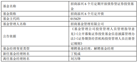招商添兴6个月定开债增聘丁悦成 刘万锋离任
