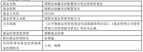 中国经济网北京9月25日讯 今日,国联安基金公告,国联安添鑫灵活配置混合增聘俞善超。 俞善超曾任中国国际金融有限公司项目经理,申银万国证券股份有限公司高级项目经理,平安资产 管理有限责任公司高级项目经理,太平洋资产管理有限责任公司项目副总裁。2021年4月加入国联安基 金管理有限公司,历任研究员、基金经理助理、基金经理。 国联安添鑫灵活配置混合A成立于2015年6月2日,国联安添鑫灵活配置混合C成立于2015年7月7 日,截至2025年9月24日,其今年来收益率为1.89%、1.81%,成立来收益率为67.83%、63.95%,累计净 值为1.6876元、1.6390元。 | 基金名称 | 国联安添鑫灵活配置混合型证券投资基金 | | --- | --- | | 基金简称 | 国联安添鑫灵活配置混合 | | 基金主代码 | 001359 | | 基金管理人名称 | 国联安基金管理有限公司 | | 公告依据 | 《公开募集证券投资基金信息披露管理办法》、《基金管理公司投资 | | | 管理人员管理指导意见》等有关法规。 | | 基金经理变更类型 | 增聘基金经理 | | 新任基金经理姓名 | 前書超 | | 共 ...
