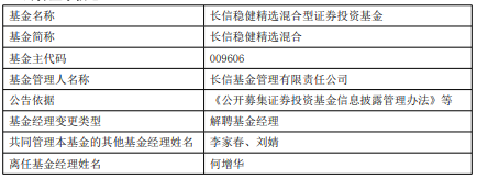 | 基金名称 | 长信利保债券型证券投资基金 | | --- | --- | | 基金简称 | 长信利保债券 | | 基金主代码 | 519947 | | 基金管理人名称 | 长信基金管理有限责任公司 | | 公告依据 | 《公开募集证券投资基金信息披露管理办法》等 | | 基金经理变更类型 | 解聘基金经理 | | 共同管理本基金的其他基金经理姓名 | 冯彬 | | 离任基金经理姓名 | 何增华 | | 基金名称 | 长信易进混合型证券投资基金 | | --- | --- | | 基金简称 | 长信易进混合 | | 基金主代码 | 003126 | | 基金管理人名称 | 长信基金管理有限责任公司 | | 公告依据 | 《公开募集证券投资基金信息披露管理办法》等 | | 基金经理变更类型 | 解聘基金经理 | | 共同管理本基金的其他基金经理姓名 | 冯彬 | | 离任基金经理姓名 | 何增华 | (责任编辑:康博) 长信利保债券A/C成立于2015年11月16日和2019年11月11日,截至2025年9月24日,其今年来收益 率为2.82%、2.72%,成立来收益率为21.47%、23.03%,累计净值为 ...