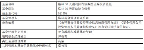 格林30天滚动持有债券增聘尹鲁晋 高洁离任