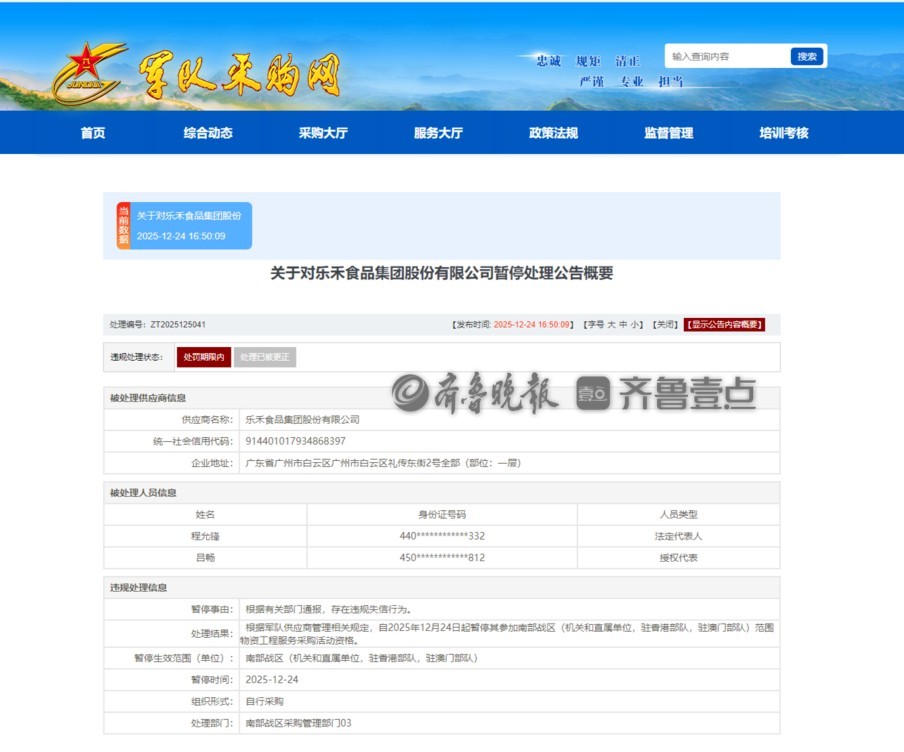乐禾食品集团股份有限公司因违规失信被南部战区暂停采购资格