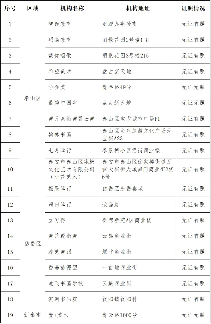 全市范围内所有无证办学的校外培训机构,要认清当前规范整治的严峻形势,主动向当地教育部门咨询 学习《泰安市教育局关于解决校外培训机构办学许可证相关问题的解决方案》文件要求,严格遵守规 定,树立合规意识,停止违规运营,全面自查办学条件,弥补自身短板,尽快向当地相关审批部门提交 资质申请材料,依法依规完善办学手续,迈向合法办学,共同营造健康有序的校外培训市场环境。 12月23日,泰安市教育局发布泰安市校外培训机构"黑名单",共29家机构被列入"黑名单",详情如下: 为贯彻落实中共中央办公厅、国务院办公厅《关于进一步减轻义务教育阶段学生作业负担和校外培训负 担的意见》(中办发〔2021〕40号)精神,进一步规范面向中小学生(含幼儿园儿童)及成人文化教育 类的校外教育培训机构办学行为,促进校外培训机构规范有序发展,营造公平竞争的市场环境,经摸 排,发现全市共有29家证照不全培训机构,违规开展培训,现将29家机构列入"黑名单"向社会公布。 | 序号 | ×域 | 机构名称 | 机构地址 | 证照情况 | | --- | --- | --- | --- | --- | | 1 | 泰山区 | 智泰教育 | 财源办事处南 | ...