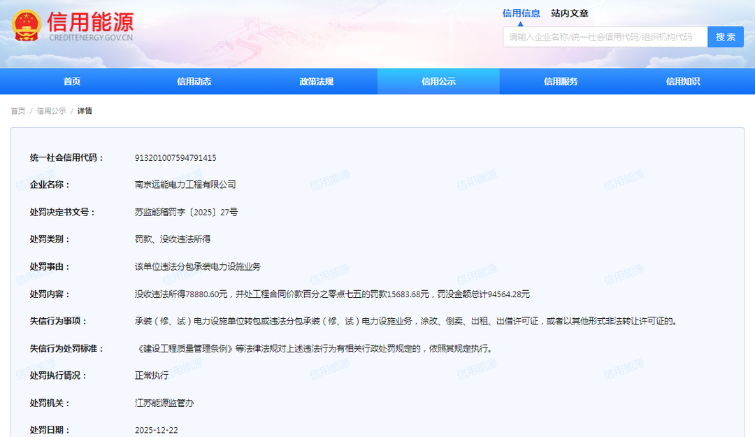 公司处罚事件 - 南京远能电力工程有限公司因违法分包承装电力设施业务受到行政处罚 [1] - 处罚机关为江苏能源监管办 处罚日期为2025年12月22日 [1][2] - 处罚决定书文号为苏监能稽罚字〔2025〕27号 [2] 处罚具体内容 - 处罚类别为罚款、没收违法所得 [1][2] - 没收违法所得金额为78,880.60元 [2][3] - 处以工程合同价款0.75%的罚款 金额为15,683.68元 [2][3] - 罚没金额总计94,564.28元 [2][3] - 处罚执行情况为正常执行 [2][3] 公司违规行为定性 - 失信行为事项为承装(修、试)电力设施单位转包或违法分包承装(修、试)电力设施业务 [2] - 处罚依据为《建设工程质量管理条例》等法律法规 [2][3] 公司基本信息 - 公司成立于2004年 法定代表人为陈庭记 [4] - 公司注册资本为43,160.8702万元人民币 [4] - 公司由南京华群能源集团有限公司全资持股 [4] - 南京华群能源集团有限公司为江苏苏电产业投资发展有限公司全资子公司 [4]