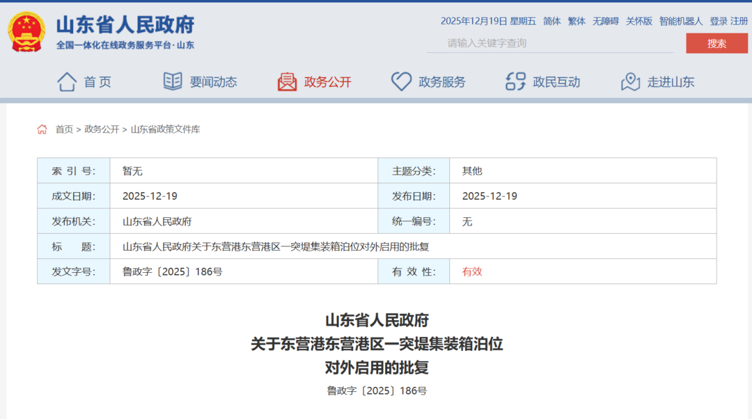 | 山东省人民政府 | | | | | 2025年12月19日 星期五 简体 繁体 无障碍 关怀版 智能机器人 登录 注册 | | | --- | --- | --- | --- | --- | --- | --- | | 全国一体化在线政务服务平台·山东 | | | | 请输入关键字查询 | | 捜索 | | 个 首页 | 町 要闻动态 | 侯 政务公开 | ( ) 政务服务 | 69 政民互动 | (21 走进山东 | | | 命 首页 > 政务公开 > 山东省政策文件库 | | | | | | | | 索 引 号: | 暂无 | | 主题分类: | 其他 | | | | 成文日期: | 2025-12-19 | | 发布日期: | 2025-12-19 | | | | 发布机关: | 山东省人民政府 | | 统一编号: 元 | | | | | 标 题: | | 山东省人民政府关于东营港东营港区一突堤集装箱泊位对外启用的批复 | | | | | | 发文字号: | 鲁政字〔2025〕186号 | | 有 效 性: | 有效 | | | 2025年12月19日 关于东营港东营港区一突堤集装箱泊位 对外启用的 ...