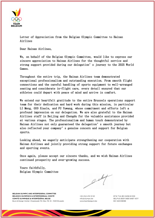 比利时代表团在成都世运会圆满收官 海南航空真情护航获赞誉