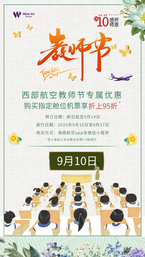 活动概述 - 西部航空于9月5日起推出面向教师群体的“敬师惠飞”主题优惠活动 [1] - 活动旨在向教育工作者表达敬意并提供出行便利,是公司践行企业社会责任的一部分 [4] 活动细节 - 优惠覆盖公司国内所有自营航线,包机航班除外 [1] - 适用航班日期为2025年9月10日至9月17日 [1] - 符合条件的教师通过海南航空官方APP或微信小程序购票,可在原有折扣基础上再享受95折优惠 [1] - 参与活动的用户需持有有效教师资格证并通过审核 [1] 销售渠道 - 优惠机票已开放销售,教师旅客可通过海南航空APP进行查询和预订 [4]