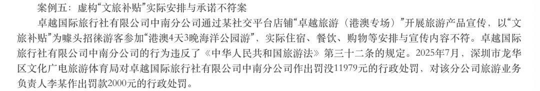 案情通报显示,卓越国际旅行社有限公司中南分公司通过某社交平台店铺"卓越旅游(港澳专场)"开展旅游产品宣传,以"文旅补贴"为噱头招徕游客参 加"港澳4天3晚海洋公园游",实际住宿、餐饮、购物等安排与宣传内容不符,违反了《中华人民共和国旅游法》第三十二条的规定。2025年7月,深圳市 龙华区文化广电旅游体育局对卓越国际旅行社有限公司中南分公司作出罚没11979元的行政处罚,对该分公司旅游业务负责人李某作出罚款2000元的行政 处罚。 值得注意的是,虽然该公司已于2025年7月17日被注销,但其总公司卓越国际旅行社有限公司,此前已连续多季上榜深圳全市被投诉旅行社排名榜单。根 据深圳市文化广电旅游体育局公布的多期深圳市旅游质监简报显示,2025年上半年,共涉及该公司的投诉件数累计达77件,是年内最多的深圳旅行社。回 溯2024年全年,该旅行社被投诉95件,是被投诉第二多的深圳旅行社。 为此,深圳市文化广电旅游体育局已连续多个季度约谈卓越国际旅行社有限公司,通过责令旅行社开展自查整改等方式,以期其自身加强企业内部管理, 切实提高旅游服务质量。但从居高不下的被投诉件数来看,约谈效果并不理想。 9月8日,文化和旅游部政府门 ...