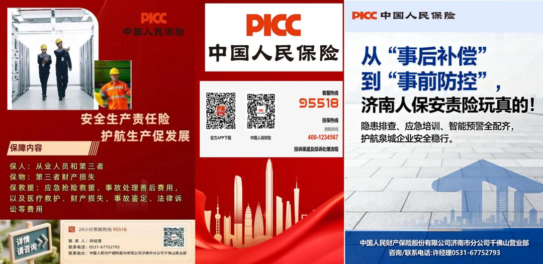 安全生产无小事,风险保障有担当。济南人保财险千佛山营业部将始终秉持"人民保险,服务人民"的初心,持续优化安全生产责任险产品与服务,深化与 泉城企业的合作,以更专业的保障、更贴心的服务,为济南地区企业筑牢安全生产防线,为区域经济高质量发展贡献保险力量。扫码添加济南人保财险千 佛山营业部服务经理,或致电0531-67752793,获取专属的科技保险方案, 携手我们,让科创之路少一份顾虑,多一份从容——您的梦想,我们共同守 护。 PICC人保财险济南市分公司简介: 中国人民财产保险公司是中组部直管的中央企业,成立于1949年,中国人民财产保险股份有限公司济南市分公司是中国人保财险在济南地区的分支机构, 是新中国成立以来济南市第一家保险公司,全市区县级经营机构19个,18个三农营销服务部,45个三农保险服务站,3724个三农保险服务点,单位员工 740余人,营销人员2000余人。近年来,公司紧跟党中央、省、市政府重大决策部署,聚焦"人民保险,服务人民"的新时代使命和内涵,坚持胸怀"国之大 者",以"八项战略服务"为抓手,切实做好"五篇大文章",聚焦"七大保险",积极落实山东省政府与中国人民保险集团战略合作协议,充分发 ...