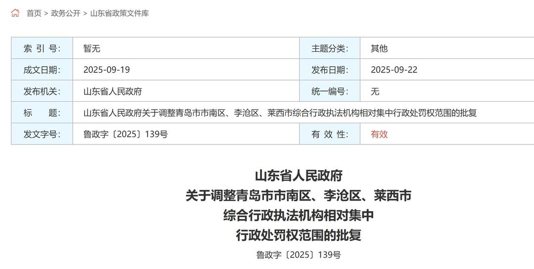 近日,山东省人民政府印发《山东省人民政府关于调整青岛市市南区、李沧区、莱西市综合行政执法机构相对集中行政处罚权范围的批复》(鲁政字 〔2025〕139号)。 | 索 引 号: | 暫元 | 主题分类: | 真他 | | --- | --- | --- | --- | | 成文日期: | 2025-09-19 | 发布日期: | 2025-09-22 | | 发布机关: | 山东省人民政府 | 统一编号: | 元 | | 标 题: | | 山东省人民政府关于调整青岛市市南区、李沧区、莱西市综合行政执法机构相对集中行政处罚权范围的批复 | | | 发文字号: | 鲁政字〔2025〕139号 | 有效性 | 有效 | 批复同意青岛市市南区、李沧区将价格监督检查方面行政处罚权分别由市南区、李沧区综合行政执法局调整至市南区、李沧区市场监督管理局;莱西市将 水产渔业管理方面行政处罚权由莱西市综合行政执法局调整至莱西市农业农村局。 上述行政处罚权调整后,与行政处罚权相关的行政检查和行政强制措施权一并调整。 批复要求,青岛市要加强对相对集中行政处罚权工作的领导,督促指导相关区、市将调整后的事项纳入政府部门权责清单并向社会公布 ...