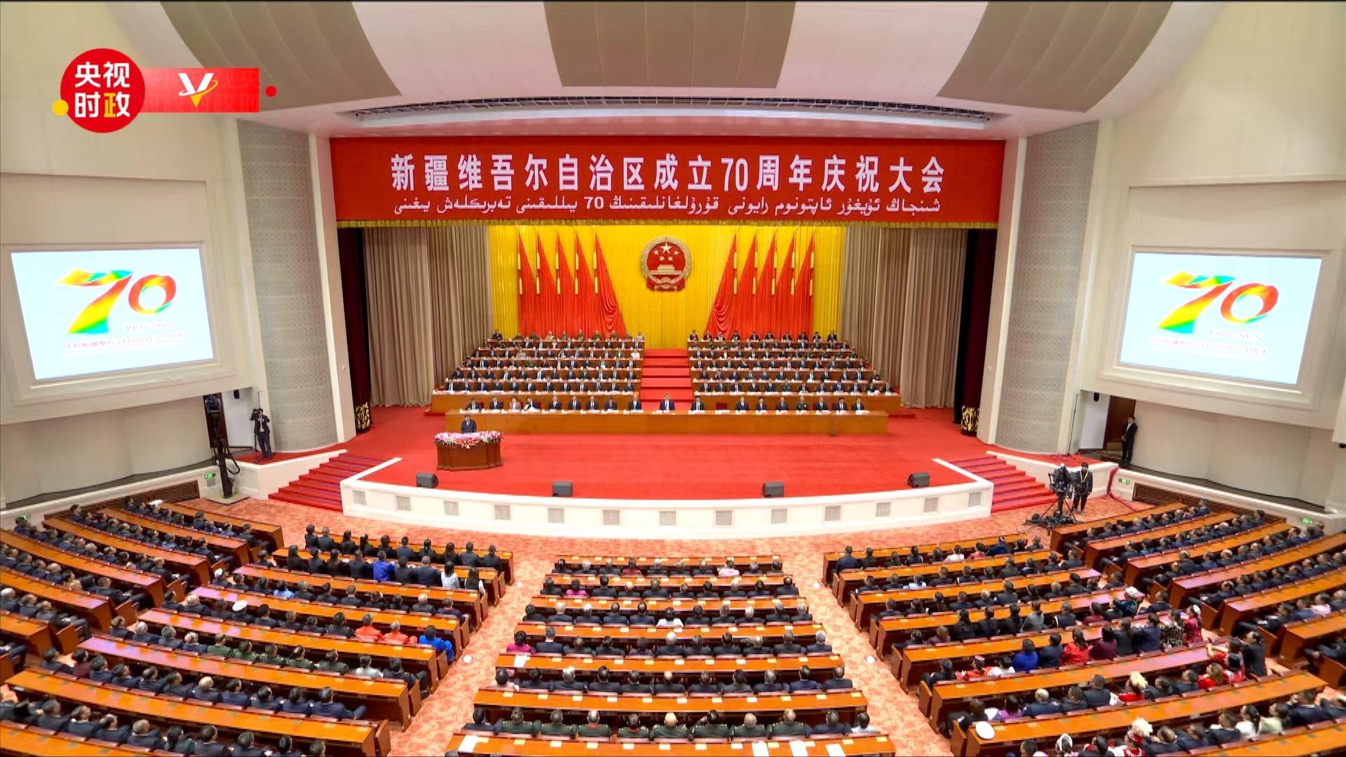砥砺奋进七十载,石榴花开别样红。新疆各族儿女牢记嘱托、感恩奋进,像石榴籽一样紧紧抱在一起,昂首阔步走在中国式现代化道路上。 25日上午,新疆维吾尔自治区成立70周年庆祝大会在新疆人民会堂隆重举行。中共中央总书记、国家主席、中央军委主席习近平出席庆祝大会。 70年前,在党中央亲切关怀和党的民族政策光辉照耀下,新疆维吾尔自治区宣告成立。70年来特别是新时代以来,在党的领导下,新疆各族人民共同当家作 主,不断夺取社会主义革命、建设和改革开放的伟大胜利。 ...