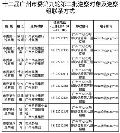 市委巡察组将深入学习贯彻习近平总书记关于党的自我革命的重要思想和关于巡视工作的重要论述,全 面贯彻巡视工作方针,认真落实二十届中央纪委四次全会、十三届省纪委四次全会和十二届市纪委五次 全会部署,紧扣市委"拼经济、保安全,办全运、提品质"工作主线,深入开展政治监督,聚焦党中央决 策部署在基层落实情况,重点了解贯彻党的二十届三中全会精神特别是落实各项重大改革任务以及省 委"1310"具体部署、市委"1312"思路举措,推动高质量发展的情况;聚焦群众身边不正之风和腐败问 题,重点了解履行全面从严治党主体责任和监督责任、落实中央八项规定精神及作风建设等情况;聚焦 基层党组织和党员队伍建设,重点了解加强领导班子建设、选人用人和干部人才队伍建设、基层党组织 建设及干部担当作为等情况;聚焦巡察整改和成果运用,重点了解落实巡视巡察监督以及审计等其他监 督发现问题整改的情况。 根据安排,对第二批单位的巡察从7月下旬开始至9月底结束。巡察期间,市委各巡察组分别设置专门值 班电话、邮政信箱、电子邮箱和"广州码上巡"微信二维码,主要受理反映被巡察党组织领导班子及其成 员、下一级党组织主要负责人和重点岗位领导干部(含已退休、已调离)问 ...