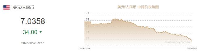 12月26日人民币对美元中间价报7.0358元 上调34个基点 广告等商务合作,请点击这里 本文为转载内容,授权事宜请联系原著作权人 中新经纬版权所有,未经书面授权,任何单位及个人不得转载、摘编或以其它方式使用。 关注中新经纬微信公众号(微信搜索"中新经纬"或"jwview"),看更多精彩财经资讯。 图源:中国外汇交易中心网站截图 来源:中国新闻网 编辑:付健青 中新网12月26日电 据中国外汇交易中心网站消息,中国人民银行授权中国外汇交易中心公布,2025年 12月26日银行间外汇市场人民币汇率中间价为:1美元对人民币7.0358元,上调34个基点。 ...