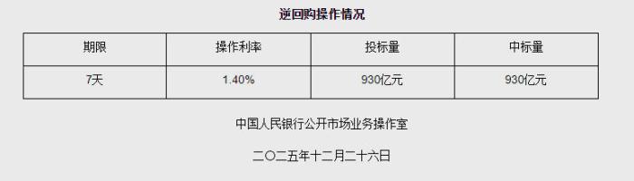央行公开市场操作 - 中国人民银行于2025年12月26日开展了公开市场逆回购操作 [1] - 本次操作规模为930亿元人民币 [1] - 操作期限为7天,操作利率为1.40% [1] - 操作采用固定利率、数量招标方式,投标量与中标量均为930亿元 [1]