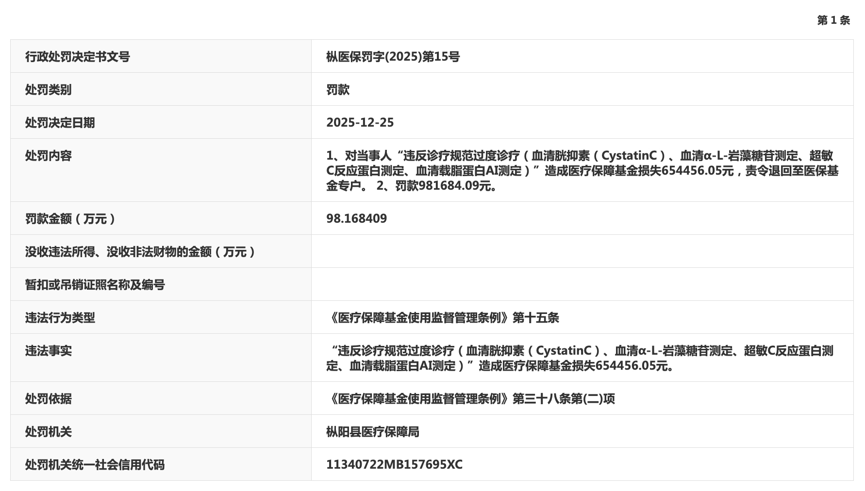 事件概述 - 枞阳县中医院因违反诊疗规范过度诊疗,被枞阳县医疗保障局处以罚款并责令退回医保基金 [1][2] - 处罚决定日期为2025年12月25日,行政处罚决定书文号为秋医保河自(2025)第15号 [2] 处罚详情 - 罚款金额为981,684.09元(约98.17万元)[1][2] - 造成的医疗保障基金损失为654,456.05元,被责令退回至医保基金专户 [1][2] - 处罚依据为《医疗保障基金使用监督管理条例》[2] - 违法行为类型为违反该条例第十五条 [2] 具体违法行为 - 过度诊疗涉及的具体检验项目包括:血清胱抑素(CystatinC)测定、血清α-L-岩藻糖苷测定、超敏C反应蛋白测定、血清载脂蛋白AI测定 [1][2] 公司背景 - 涉事医院为枞阳县中医院,位于安徽省铜陵市枞阳县 [1][2] - 医院始建于1985年,占地面积37.5亩,建筑面积16,000平方米 [2] - 医院性质为集医疗、教学、预防、康复于一体的二级甲等中医医院 [2] - 医院是枞阳县医保和新农合定点医院 [2]