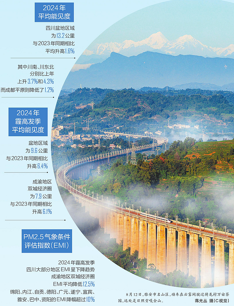 2024年 平均能见度 四川盆地区域 为13.2公里 与2023年同期相比 平均升高1.6% 其中川南、川东北 分别比上年 上升 3.7%和4.3% 而成都平原则降低了1.2% 2024年 霾高发季 平均能见度 盆地区域 为9.6公里 与2023年同期相比 升高6.4% 成渝地区 双城经济圈 为7.9公里 与2023年同期相比 升高6.1% PM2.5气象条件 评估指数(EMI) 2024年霾高发季 四川大部分地区EMI 呈下降趋势 成渝地区双城经济圈 EMI平均降低12.5% 绵阳、内江、自贡、德阳、广元、遂宁、宣宾、 雅安、巴中、资阳的EMI降幅超过10% 8月12日,雅安市名山区,动车在云雾间驶过骑龙村万亩茶 因,远处是日照贡嘎金山。 蒋光丛 摄(C视觉) 日前,省气象局发布《2024年四川省大气环境气象公报》(以下简称公报)。公报显示:2024年四川大气环 境有所改善,盆地区域平均能见度比2023年有升高,臭氧高发季盆地区域平均对流层NO2柱浓度比2023年减少, 霾高发季大气污染扩散气象条件整体好于2023年同期。 盆地区域气象条件整体变好 能见度的变化主要取决于大气透明度的好坏,能见度升高,说明气 ...