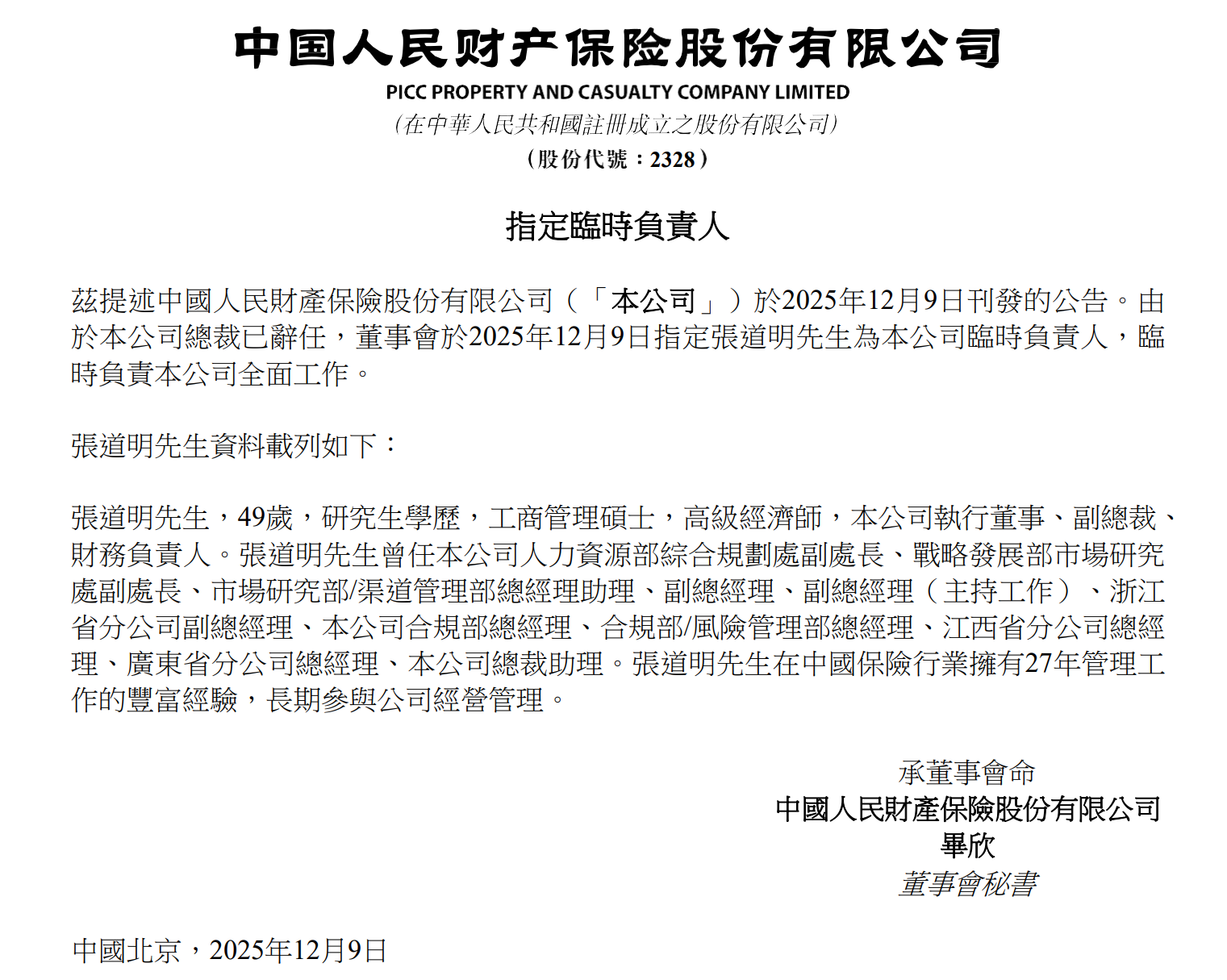 原总裁于泽被查,人保财险副总裁张道明任临时负责人