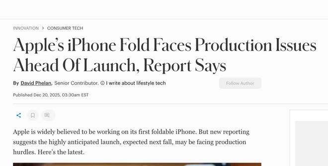 来源:环球网 【环球网科技综合报道】12月21日消息,据《福布斯》报道,苹果公司正在研发其首款可折叠iPhone已 是公开的秘密。然而最新报告显示,这款备受期待、原定于明年秋季亮相的产品,可能正遭遇生产方面 的挑战。 不过先别急着期待——情况可能更为复杂。郭明錤补充说明:"由于早期生产良率及产能爬坡面临挑 战,实际顺利出货可能要等到2027年。加之预期需求强劲而供应有限,可折叠iPhone在2026年底前很可 能持续面临缺货局面。" 苹果近年来已很少遇到新产品严重供不应求的情况。虽然2017年iPhone X曾将发售时间推迟数周,但上 一次出现类似程度的交付延迟,还要追溯到2016年第一代AirPods发布之时。 那么这意味着什么?先从时间线看起。下一代iPhone旗舰机型预计将于2026年秋季发布——尽管iPhone 17e可能提前至春季上市。目前距离发布还有近十个月,这段时间通常足以让苹果调整生产节奏。 这份报告来自备受业界关注的天风证券分析师郭明錤。他在最新研究报告中指出:"可折叠iPhone的研 发进度目前落后于预期,但预计仍能在2026年下半年正式发布。" 回顾2025年初,iPhone Air也曾 ...