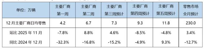 来源:环球网 【环球网科技综合报道】12月20日消息,乘联分会日前发布的最新报告显示,初步推算12 月狭义乘用 车零售总市场规模约为230万辆,环比增长3.4%,同比下降12.7%。其中新能源零售量预计为138万左 右,渗透率预计可达60%。 | 单位: 万辆 | 主要厂商 | 主要厂商 | 主要厂商 | 主要厂商 | 主要厂商 | 零售市场 | | --- | --- | --- | --- | --- | --- | --- | | | 第一周 | 第二周 | 第三周预计 | 第四周预计 | 第五周预计 | 全月预计 | | 12 月主要厂商日均零售 | 4.2 | 6.7 | 7.3 | 9.3 | 11.8 | 230.0 | | 环比 2025 年 11月 | -7.8% | 8.8% | 4.6% | -8.5% | -4.8% | 3.4% | | 同比 2024年12月 | -32.3% | -16.8% | -15.2% | -4.9% | 9.3% | -12.7% | 乘联分会表示,11月底厂商集中冲量,致使12月初车市热度回落,第一周日均零售4.2万辆,同比下降 32.3%,环比下降7 ...