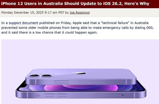 来源:环球网 【环球网科技综合报道】12月16日消息,据MacRumors报道,苹果公司于周五发布支持文件,证实澳大 利亚地区部分旧款 iPhone 因技术故障,在特定情况下无法通过拨打当地紧急电话 000 接通救援服务。 苹果方面表示,该故障再次发生的概率较低,相关方已着手采取优化措施。 根据苹果官方说明,此次故障主要影响澳大利亚偏远地区的部分用户。当用户的主用移动网络不可用 时,即便周边存在其他可用网络,且按正常机制应自动转接紧急呼叫,受影响设备仍无法成功拨通 000。文件同时提及,移动运营商正积极采取措施,以降低未来类似问题的发生风险。 值得注意的是,此次故障并非苹果设备专属,近期已有新闻报道显示三星部分手机也受到类似影响。苹 果明确了不受影响的机型范围:iPhone XS、iPhone XR、iPhone 11 以及所有 iPhone 13 及更新机型均未 受波及。针对 iPhone 12 用户,苹果指出上周发布的 iOS 26.2 系统更新已针对该场景提供支持,可有效 避免类似问题。 对于更早期的 iPhone 机型,苹果表示若后续确认其同样受该故障影响,相关用户将直接从所属移动运 营商处获得进一步 ...