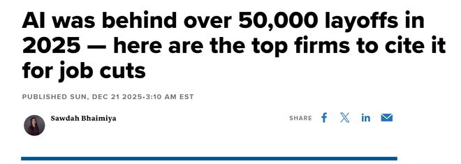 来源:环球网 【环球网科技综合报道】12月22日消息,据CNBC报道,裁员已成为 2025 年美国就业市场的一大特 征,包括亚马逊和 Salesforce 在内的多家大型公司宣布因人工智能而裁减了数千个工作岗位。 据咨询公司 Challenger, Gray & Christmas 预测,到 2025 年,人工智能将导致美国近 5.5 万人失业。 外媒称,在通货膨胀加剧、关税增加开支、企业寻求削减成本之际,人工智能为解决这一问题提供了一 个有吸引力的短期方案。 麻省理工学院在 11 月发布的一项研究表明,人工智能已经可以取代美国劳动力市场 11.7% 的工作,并 在金融、医疗保健和其他专业服务领域节省高达 1.2 万亿美元的工资。 并非所有人都相信人工智能是导致大规模裁员的真正原因,正如牛津互联网研究所人工智能助理教授法 比安·斯蒂芬尼此前告诉 CNBC 的那样,这可能只是一个借口。 斯蒂芬尼表示,许多前几年表现良好的公司"严重超额招聘",而最近的裁员可能只是"市场清理"。"在 某种程度上,这是在解雇那些没有可持续的长期发展前景的人,他们不再说'我们两三年前就误判了', 而是开始寻找替罪羊,说'这都是人工智能 ...