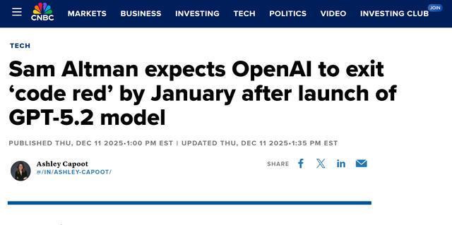 来源:环球网 【环球网科技综合报道】12月12日消息,当地时间周四,OpenAI正式推出最新AI大模型 GPT-5.2,此举 被视为对谷歌 Gemini 3 模型的针对性回应。OpenAI CEO 山姆・奥特曼(Sam Altman)当日在接受 CNBC 采访时表示,谷歌 Gemini 3 对公司业绩指标的实际影响低于初期预期,公司计划于明年 1 月结 束此前为应对竞争而启动的 "红色警报" 状态。 本次发布的 GPT-5.2 模型分为三个版本,以满足不同场景需求:即时版聚焦文本生成与信息查询功能, 主打高效响应速度;思考版在编码、规划等结构化工作中表现突出;专业版则针对复杂难题提供高精度 解决方案,全方位提升用户使用体验。(纯钧) 据悉,此前面对谷歌 Gemini 3 带来的市场竞争压力,OpenAI 内部启动 "红色警报" 机制,集中核心资 源对 ChatGPT 进行优化升级。奥特曼表示,面对行业竞争威胁,企业需保持专注并快速响应,这一机 制为技术迭代提供了重要保障。 ...