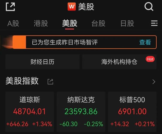 美股市场表现 - 道琼斯工业平均指数上涨1.34%至48704.01点,创下历史新高 [1] - 标普500指数上涨0.21%至6901点 [1] - 纳斯达克综合指数下跌0.25%至23593.86点 [1] 科技与芯片股 - 万得美国科技七巨头指数下跌0.71% [3] - 谷歌股价下跌超过2%,英伟达下跌近2%,特斯拉下跌超过1%,亚马逊下跌0.65%,苹果下跌0.25% [3] - 微软股价上涨超过1%,脸书上涨0.40% [3] - 费城半导体指数下跌0.75% [3] - ARM股价下跌超过3%,迈威尔科技下跌超过3%,英特尔下跌超过3%,美光科技下跌超过1%,应用材料下跌超过1% [3] - 微芯科技股价上涨超过1% [3] 银行股 - 银行股集体上涨,摩根大通上涨超过2%,高盛上涨超过2%,富国银行上涨超过2% [3] - 花旗上涨0.59%,摩根士丹利上涨0.33%,美国银行上涨近1% [3] 中概股 - 纳斯达克中国金龙指数微涨0.05% [3] - 万得中概科技龙头指数下跌0.17% [3] - 阿特斯太阳能股价上涨超过3%,小马智行上涨超过3%,贝壳上涨约3%,满帮集团上涨超过2%,陆控上涨超过2% [3] - 金山云股价下跌超过5%,BOSS直聘下跌超过3%,再鼎医药下跌超过2%,好未来下跌超过2%,小鹏汽车下跌超过2% [3] 重点公司动态 - 甲骨文股价下跌近11%,因季度营收不及预期且上调支出预期,引发市场对其债务状况的担忧 [3] 宏观经济数据 - 美国上周初请失业金人数为23.6万人,高于预期的22万人 [4] - 至11月29日当周续请失业金人数为183.8万人,低于预期的194.7万人 [4] - 美国9月贸易逆差降至528亿美元,为2020年中期以来最低水平,远低于预期的633亿美元 [5] 欧洲市场与大宗商品 - 欧洲三大股指全线上涨,英国富时100指数上涨0.49%,法国CAC40指数上涨0.79%,德国DAX指数上涨0.68% [5] - WTI原油期货价格下跌1.47%至57.60美元/桶 [5] - 布伦特原油期货价格下跌1.49%至61.28美元/桶 [5]