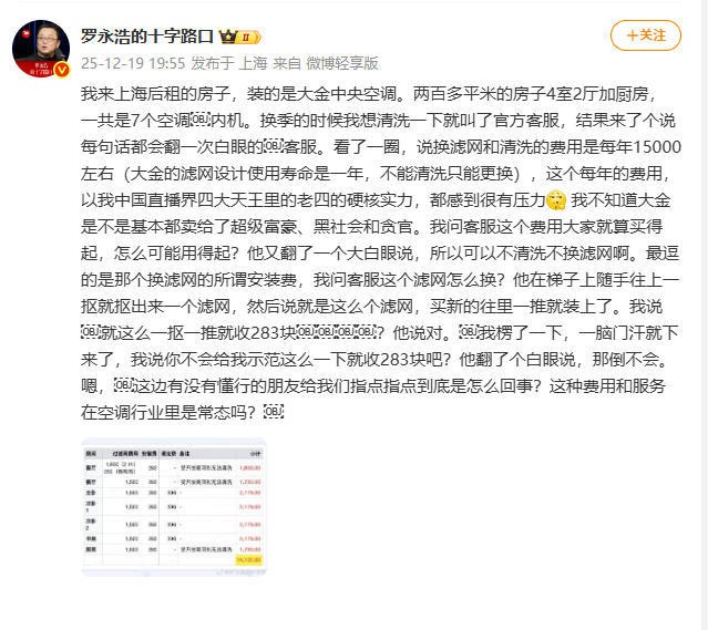凤凰网科技讯12月20日昨日,罗永浩在社交媒体发文,公开质疑大金中央空调的售后维护价格体系及服 务态度。据罗永浩透露,其在上海租住的房屋面积约为两百多平米,共安装了7台大金空调内机。他在 换季申请官方清洗服务时获悉,该品牌滤网设计寿命仅为一年且"不可清洗只能更换",算上清洗费与耗 材更换,每年的维护成本高达15000元左右。面对这一报价,罗永浩直言即便以其经济实力也感到颇有 压力。 | 图片 | | 12面同商网 分别网 新浪费 高注 | | 104 | | --- | --- | --- | --- | --- | | ET | LADO DE FAI [3] 南库用 | 166 | → 景中国国际无法国际 【发出版 | | | 展示 | | 1,500 . [80] | -- 黄川城美国民大公寓落 1.78888 | | | 25 | | 1,848 M | RIB-18 10 | B.F.Ph.Jack | | 10 | | 1.040 . 0.0 | 830 = Jr. 1 71g-5d | | | 31 n | | 1,040 Ball | ROO - J. 115.04 | | | 01.00 | ...