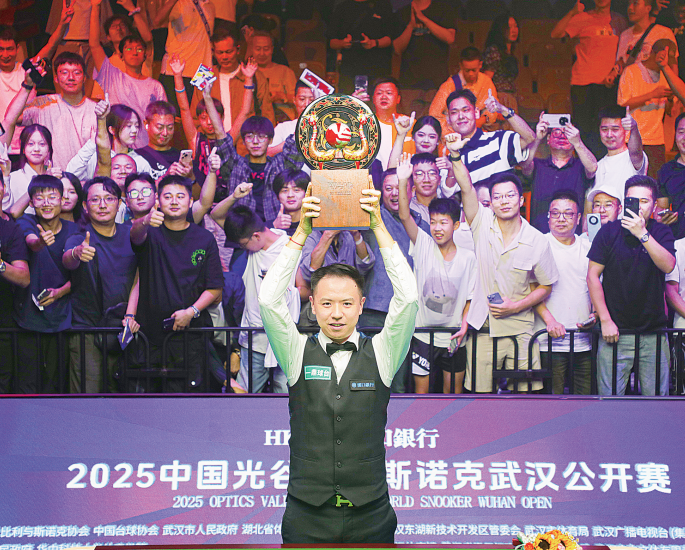 8月30日,2025中国光谷世界斯诺克武汉公开赛进入决赛日。中国选手肖国栋经过长达 19局的缠斗,最终幸运地以10∶9险胜英国选手加里·威尔逊,继去年在武汉夺冠后成功卫 冕。 比赛于当天下午2时开始,肖国栋开局连胜两局,让主场观众看到了他卫冕的希望。然 而加里·威尔逊很快展现了"出租车司机"的韧性,第三局在0∶12落后的情况下逆转取胜,之后 又连胜两局将比分反超为3∶2。 肖国栋迅速做出调整,拿下第六局追平比分,然后在第七局打出个人本场决赛的首杆50 +(单杆62分),接着再胜一局,将领先优势扩大到5∶3。第九局,加里·威尔逊用一杆116 分的破百还以颜色,证明了自己连续淘汰四位TOP16选手的实力并非偶然。 颁奖仪式上,肖国栋高高举起奖杯 场"马拉松"式的决斗。 打入最后一粒黑球时,肖国栋手抚胸口,长舒一口气。之前在击败威廉姆斯闯入决赛 后,肖国栋曾说自己"像做梦一样",同时坦言"要把冠军留在中国",如今,他兑现诺言梦想 成真。 夺得冠军,让肖国栋成为斯诺克历史上第14位实现排名赛卫冕的选手,同时也是实现排 名赛卫冕的首位中国球员。本次比赛后,他的世界排名将升至第8位,创职业生涯新高。 编辑:代婧怡 中场休 ...