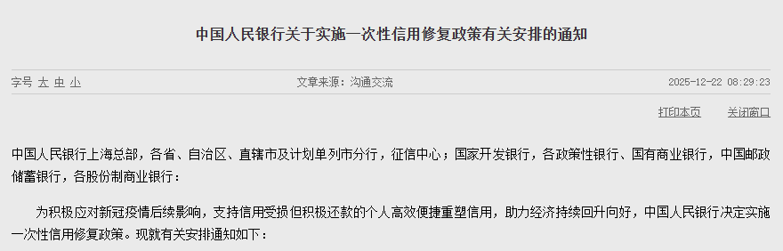 政策核心内容 - 中国人民银行推出一次性个人征信逾期记录修复政策 核心观点是允许符合条件的个人小额逾期记录在足额偿还后从信用报告中消除 旨在减轻特定人群的信用负担 [7] - 政策覆盖2020年1月1日至2025年12月31日期间发生且已结清的单笔金额在1万元以下的逾期记录 [3] - 适用对象限定于人民银行征信系统中展示的个人信贷逾期信息 [4] 适用条件与金额 - 单笔逾期金额不超过1万元 此金额规定包括借款本金、利息、罚息等总和 [5][7] - 个人必须在2026年3月31日(含)前足额偿还逾期债务 [6] - 政策不区分信用卡、房贷、消费贷等业务类型 只要符合条件均可修复 [7] 处理机制与时间安排 - 根据还款时间分两种情形处理:若在2025年11月30日(含)前足额还款 对应逾期信息自2026年1月1日起不再展示;若在2025年12月1日至2026年3月31日期间足额还清 对应逾期信息在还款次月月底前不再展示 [8] - 政策设置3个月宽限期 还款时限延长至2026年3月31日 给予借款人充足还款时间 [10][12] - 在2026年3月31日前按规定足额还款 都能纳入系统自动修复范围 无需跑网点、填材料 [7][11] 征信报告调整与查询配套 - 符合条件的逾期信息在信用报告中的“还款状态”将由逾期标识调整为“正常标识” “逾期金额”将由1万元以下的非0数值调整为0 [9] - 个人名下多笔逾期记录如符合条件均可适用政策调整 未还清或超标的记录仍会显示 [9] - 作为配套福利 人民银行将在2026年上半年额外增加2次个人信用报告线下免费查询机会 此前每年线下前2次免费 第3次起需付费 [13] - 公众可通过金融机构手机银行APP、网上银行、银联云闪付APP及征信中心官网线上查询 也可通过线下服务网点查询 [13]