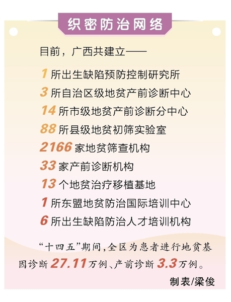 广西是地贫高发地区,重型地贫患儿需长期依赖输血,且容易因输血带来的铁过载严重损害健康, 也为家庭和社会带来沉重负担。"血常规初筛是守好地贫防治的第一关。"在良庆区婚育综合服务中心, 南宁市第二妇幼保健院保健科主任周璇介绍,对筛查出的双阳性夫妇,服务中心的驻点医务人员会为其 安排免费地贫基因诊断,精准识别同型地贫基因携带者,为后续的产前诊断提供依据。 目前,广西已建成101个集免费婚检、婚姻登记、优生优育咨询、计划生育指导于一体的一站式婚 育综合服务平台。"十四五"以来,全区累计为177.37万人提供免费婚前医学检查服务,婚检率持续保持 在99%以上,连续多年位居全国第一。 近年来,广西还不断加大地贫防控惠民力度,除了为婚育人群提供地贫血常规初筛、地贫基因诊 断,还有地贫产前诊断、地贫血红蛋白分析复筛和重症地贫胎儿医学干预共5项免费技术服务,使地贫 防控技术服务实现全过程免费。 "信息化手段也是地贫防治工作的强力支撑。"广西出生缺陷预防控制研究所办公室负责人何升表 示。该研究所依托自治区妇幼保健院设立,在这里,工作人员轻点鼠标,打开桂妇儿健康服务信息管理 系统,就能对全区地贫基因数据库与地贫患儿数据库进行统筹管 ...