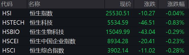 12月11日,香港恒生指数收跌0.04%,恒生科技指数跌0.83%。 传媒、医疗设备、有色金属、石油石化等板块跌幅居前,电气设备、银行、国防军工、房地产等板块上 涨。 中兴通讯跌超13%。中兴通讯今日公告,公司已知悉近期新闻媒体针对本公司涉及美国《反海外腐败 法》合规性调查的报道。公司正与美国司法部就有关事项进行沟通,并将通过法律等手段坚决维护自身 权益。公司反对一切形式的腐败行为,对任何可能相关的个人持零容忍态度。公司目前生产经营一切正 常。 编辑丨瑜见 | 代码 | 名称 | 现价 | 涨跌 | 涨跌幅 | | --- | --- | --- | --- | --- | | HSI | 恒生指数 | 25530.51 | -10.27 | -0.04% | | HSTECH 恒生科技 | | 5534.59 | -46.51 | -0.83% | | HSBIO | 恒生生物科技 | 15049.99 | -43.04 | -0.29% | | HSCEI | 恒生中国企业指数 | 8934.28 | -20.41 | -0.23% | | HSCI | 恒生综合指数 | 3902.14 | -11.02 ...