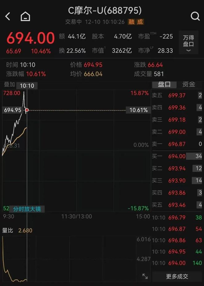 12月10日盘中,摩尔线程一度拉升涨超15%,站上700元大关,创上市新高。截至发稿,涨幅达 10.46%,报694元/股,成交额超44亿元。 编辑 | 钉钉 | G | C摩尔-U(688795) | | | | | --- | --- | --- | --- | --- | | | 交易中 12-10 10:10:26 融 成 | | | | | 694.00 | 额 44.1亿 股本 4.70亿 市盈 -225 | | 万得 营口 | | | 65.69 10.46% | 3262亿 市净 28.33 换 22.56% 市值 | | | | | 时间 10:10 | 价格 694.95 涨跌 66.64 | | | | | 涨跌幅 10.61% | 均价 666.04 成交量 581 | | | | | 叠加 10:10 | | 第二 | 负责 | | | 728.00 | | 15.87% 卖五 699.37 | | 2 | | 694.95 | 24 M 10.61% | | 699.36 | 4 | | | | | 699.18 | 2 | | | | | 699.00 | 4 | | | 0.0 ...