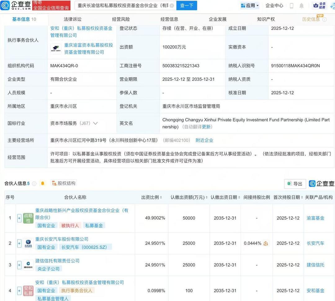 | 序号 | | 合伙人名称 | 出资比例 = | | | 认缴出资额(万元) : 认缴出资日期 : 间接持股比例 首次持股日期 关联产品/机构 | | | | --- | --- | --- | --- | --- | --- | --- | --- | --- | | | | 重庆战略性新兴产业股权投资基金合伙企业(有 | | | | | | | | | | 限合伙) | 49.9002% | 50000 | 2035-12-31 | | 2025-12-12 | 渝富基金 | | | | 国有企业 被执行人 私募基金 | | | | | | | | | V | 重庆长安汽车股份有限公司 | | | | | | | | 2 | | 国有企业 长安汽车 (000625.SZ) | 24.9501% | 25000 | 2035-12-31 | 0.0444% % | 2025-12-12 | 长安汽车 | | | C | 建信信托有限责任公司 | | | | | | | | 3 | 障情修托 | 央企子公司 | 24.9501% | 25000 | 2035-12-31 | ା | 2025-12-12 | ...