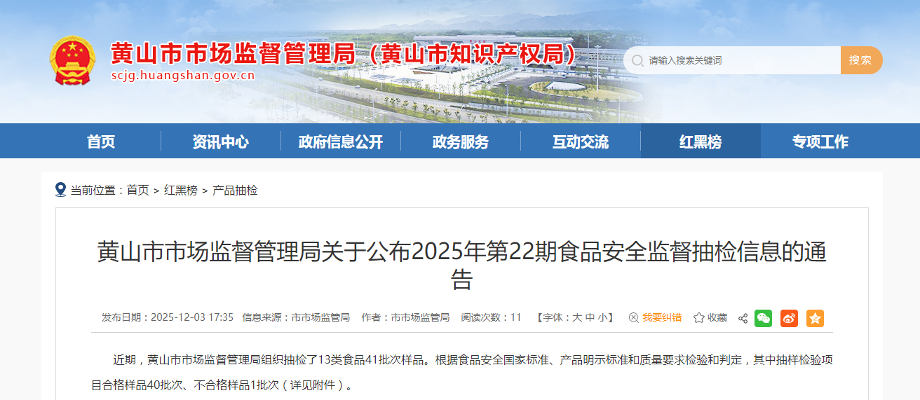 安徽省黄山市市场监督管理局关于公布2025年第22期食品安全监督抽检信息的通告