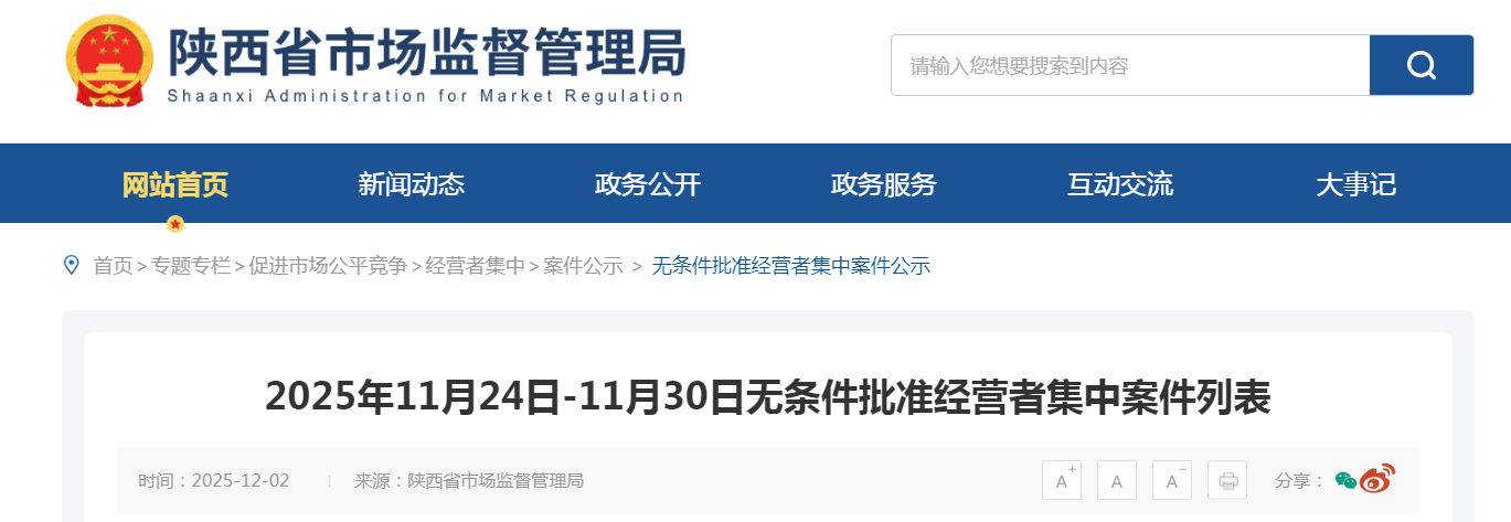2025年11月24日-11月30日无条件批准经营者集中案件列表