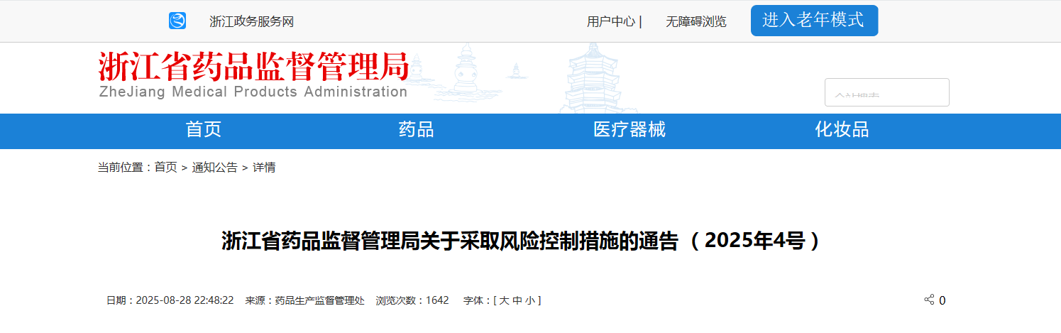 浙江省药品监督管理局关于采取风险控制措施的通告 (2025年4号)