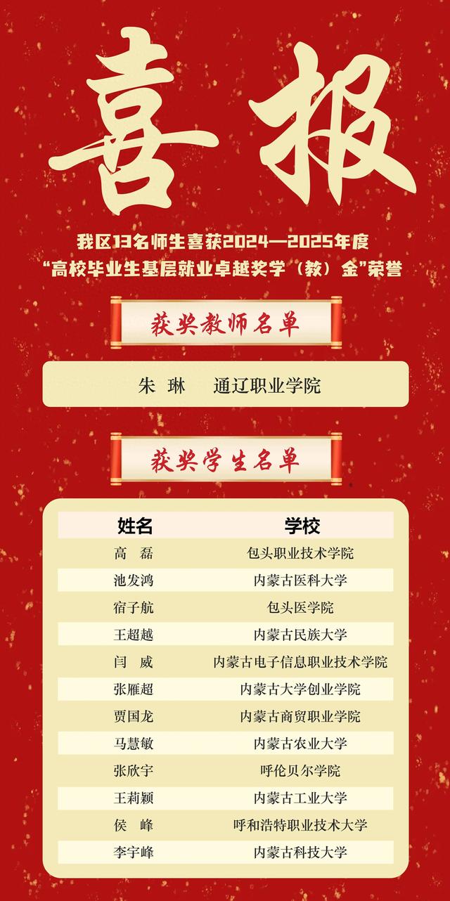 转自:草原云 12月20日,记者从内蒙古自治区教育厅了解到,2024—2025年度"高校毕业生基层就业卓越奖学(教) 金"获奖名单近日公布,全国共奖励学生418人、教师58人。其中,通辽职业学院教师朱琳、包头职业技 术学院毕业生高磊等13名内蒙古师生获此殊荣。 | 张雁超 | 内蒙古大学创业学院 | | --- | --- | | 贾国龙 | 内蒙古商贸职业学院 | | 马慧敏 | 内蒙古农业大学 | | 张欣宇 | 呼伦贝尔学院 | | 王莉颖 | 内蒙古工业大学 | | 侯 峰 | 呼和浩特职业技术大学 | | 李宇峰 | 内蒙古科技大学 | 内蒙古日报·草原云记者:刘志贤 ...