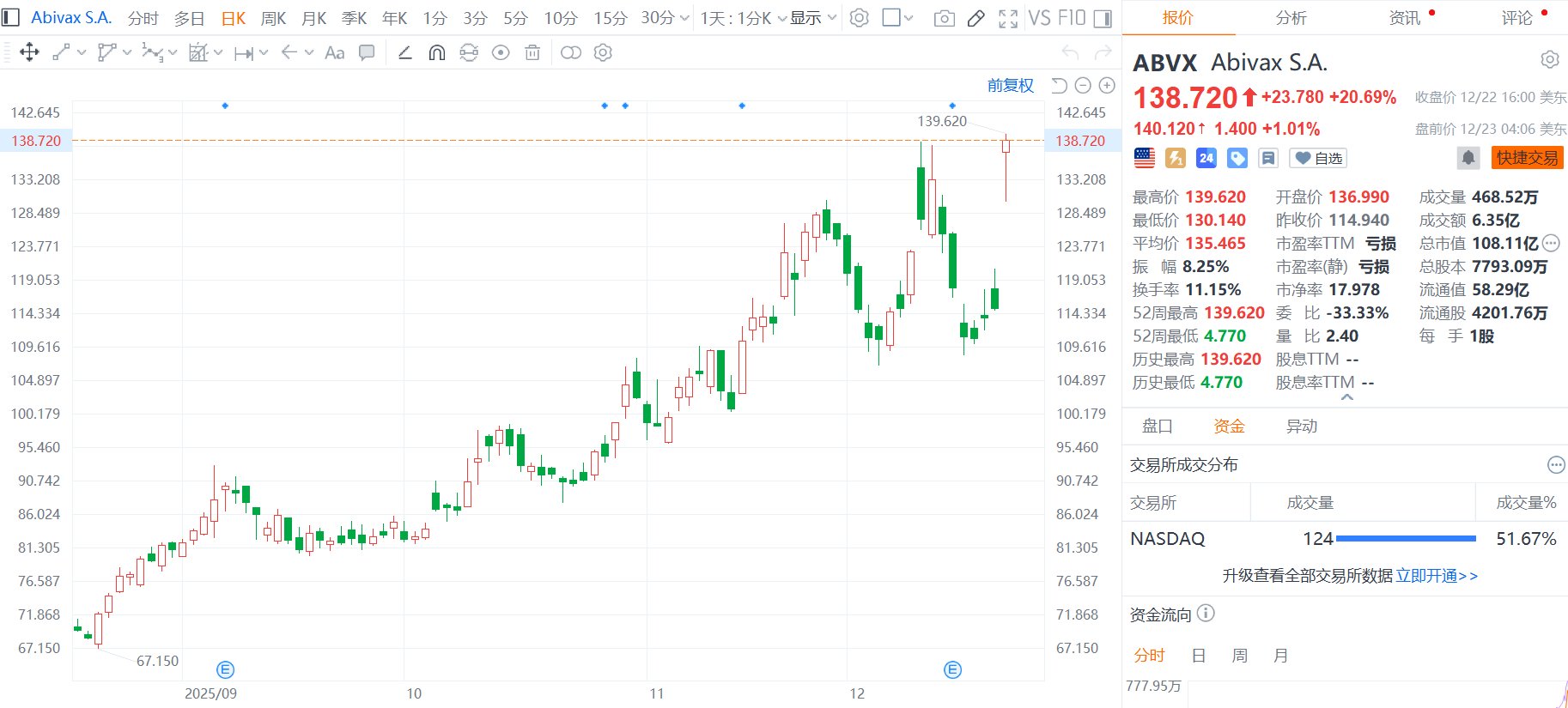 | | | ■ Abivax S.A. 分时 多日 日K 周K 月K 季K 年K 1分 3分 5分 10分 15分 30分 v 1天:1分K ▽显示 ▽ ② | | | | --- | --- | --- | --- | --- | | : # | 日ののかない 盛い HV ← × Aa ロ < の 受 ○ 回 | 0 @ | | | | 142.645 | | | | 139. | | 138.720 | | | | | | 133.208 | | | | | | 128.489 | | | | | | 123.771 | | | | | | 119.053 | | | | | | 114.334 | | | | | | 109.616 | | | | | | 104.897 | | | | | | 100.179 | | | | | | 95.460 | | | | | | 90.742 | | | | | | 86.024 | | | | | | 81.305 | | | | | | 76.587 | | | | | | 71.868 | | | | | | 67.150 | 67.150 | | | ...