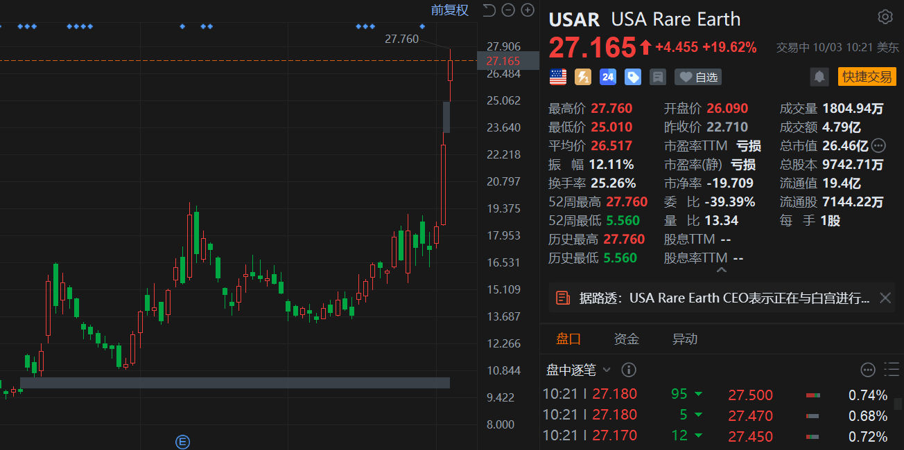 昨日大涨超23%的美国稀土公司(USAR)再度上扬超20%,此前该公司CEO芭芭拉·汉普顿(Barbara Humpton)透露正与特朗普政府进行谈判,讨论的重点是加 强美国稀土供应链,这是在争夺这些关键材料的全球竞争中的一项战略优先事项。 ...