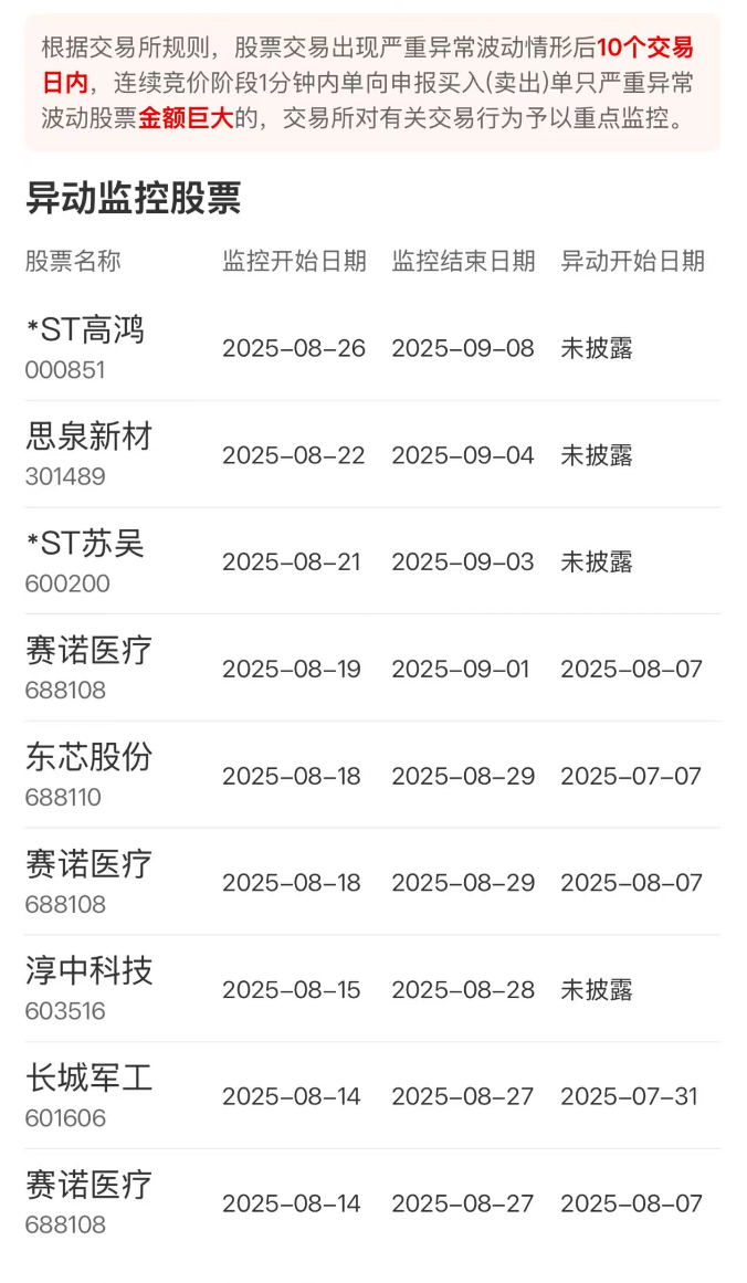根据交易所规则,股票交易出现严重异常波动情形后10个交易 日内,连续竞价阶段1分钟内单向申报买入(卖出)单只严重异常 波动股票金额巨大的,交易所对有关交易行为予以重点监控。 异动监控股票 | 股票名称 | 监控开始日期 监控结束日期 异动开始日期 | | --- | --- | | *ST高鸿 | 2025-08-26 2025-09-08 未披露 | | 000851 | | | 愚泉新材 | 2025-08-22 2025-09-04 未披露 | | 301489 | | | *ST苏吴 | 2025-08-21 2025-09-03 未披露 | | 600200 | | | 赛诺医疗 | 2025-08-19 2025-09-01 2025-08-07 | | 688108 | | | 东芯股份 | 2025-08-18 2025-08-29 2025-07-07 | | 688110 | | | 赛诺医疗 | 2025-08-18 2025-08-29 2025-08-07 | | 688108 | | | 淳中科技 | 2025-08-15 2025-08-28 未披露 | | 603516 | | ...