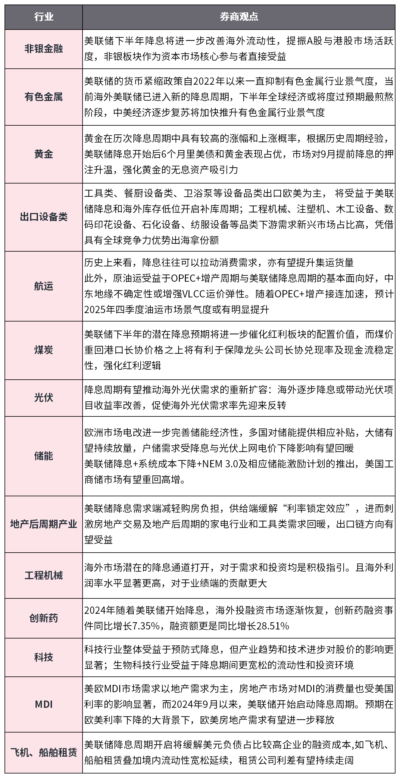 美联储降息预期 - 美国7月CPI同比+2 7%低于市场预期的+2 8% [1] - 光大证券预测9月降息概率升至94 3% 高盛和摩根大通预计9月、10月、12月各降25基点 [1] - 花旗基准情景预测政策利率降至3% 美国财长贝森特主张9月先降50基点 全年累计降150-175基点 [1] 资金流向与市场影响 - 联博基金指出降息可能削弱美国资产吸引力 推动资金流入新兴市场股市 [1] - 历史数据显示降息后6个月内美债和黄金表现占优 黄金无息资产吸引力增强 [1][2] 受益行业分析 有色金属 - 美联储货币紧缩政策自2022年抑制行业 降息周期将推升全球经济复苏 加快行业景气度回升 [1] - 黄金在历次降息周期中涨幅和上涨概率较高 [1] 出口设备类 - 工程机械、注塑机等品类受益于海外补库周期 新兴市场需求具有全球竞争力优势 [1] - 工具类、餐厨设备等出口欧美为主 降息叠加库存低位刺激需求 [1] 能源与运输 - 煤炭行业长协价格回升保障龙头公司兑现率 强化红利逻辑 [1] - 原油运输受益于OPEC+增产周期与降息共振 VLCC运价弹性增强 2025Q4景气度或显著提升 [1] 新能源 - 光伏海外需求因降息改善项目收益率 有望率先反转 [2] - 欧洲电改提升储能经济性 户储受降息与光伏电价下降刺激 商储市场或重回高增 [2] 地产相关 - 降息减轻购房负担 缓解利率锁定效应 刺激家电和工具类需求回暖 [2] - 美欧MDI需求以地产为主 利率下降有望释放房地产需求 [2] 科技与创新 - 科技行业整体受益于预防式降息 生物科技受宽松流动性提振更显著 [2] - 2024年海外投融资市场恢复 软件融资额同比+28 51% [2] 租赁行业 - 飞机船舶租赁公司美元负债压力缓解 境内流动性宽松延续利差 [2] 历史龙头表现 - 2024年9月19日美联储降息50基点后 惠发食品(+10 04%)、千味央厨(+9 99%)等大消费股涨停 [3][4] 重点标的 - 非银金融:同花顺、华泰证券、中国平安等 [5] - 美国后地产周期:巨星科技、TCL科技、海尔智家等 [5] - 黄金板块:赤峰黄金、中金黄金 [5] - 工程机械:三一重工、中联重科、徐工机械 [5]