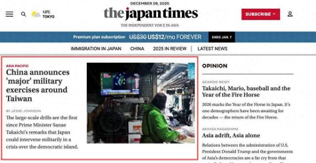 中国青年报客户端讯(中青报·中青网记者 马子倩)在中日关系因日本首相高市早苗妄称"台湾有事"可 能构成日本可行使集体自卫权的"存亡危机事态"的挑衅言论陷入低谷之际,中国人民解放军军事演习相 关新闻,迅速登上各大日媒头条。 12月29日开始,中国人民解放军东部战区组织海空兵力实施环台岛战备警巡,舰机多向抵近台岛邻近海 空域,旨在检验战区部队快速机动、立体布势、体系封控能力。 日本历史最悠久的英文日报《日本时报》在网站头条位置刊发题为《中国宣布在台湾周边举行"大规 模"军事演习》。报道称,12月29日,中国(大陆)在台湾周边组织陆军、海军、空军和导弹部队举 行"大规模"军事演习。这是自高市早苗首相11月初宣称"日本可能对台湾进行军事干预"以来,中方首次 举行此类演习。 报》报道截图 报道援引军事专家的分析说,从海报中显示的地理方位来看,两块盾牌"精确地封锁"了宫古海峡和巴士 海峡——这是台湾岛对内物资补给和对外舰机疏散的重要通道。 日本三大综合性日文报纸之一、日本《朝日新闻》也将中国人民解放军东部战区军事演习相关新闻放在 网站首页。报道援引施毅陆军大校的话称,解放军此次演习是"对'台独'分裂势力和外部干涉势力的严 ...