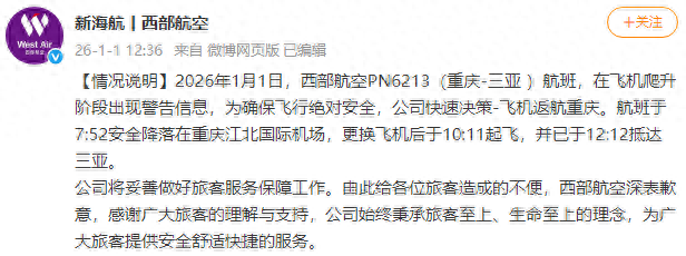 南京晨报2026-01-01 14:35:41 航丨西部航空 编辑:宁宁 责编:李君伟 今天,西部航空发布情况说明:2026年1月1日,西部航空PN6213(重庆-三亚 )航班,在飞机爬升阶段 出现警告信息,为确保飞行绝对安全,公司快速决策——飞机返航重庆。航班于7:52安全降落在重庆江 北国际机场,更换飞机后于10:11起飞,并已于12:12抵达三亚。 来源:@新海 ...