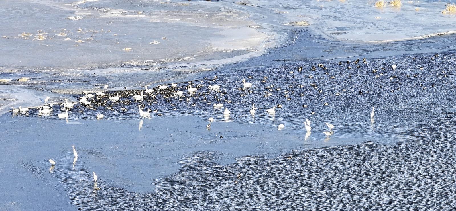 俯瞰田格里湿地。 游曳的水鸟。 田格里湿地水鸟监测现场。 和谐相处。 2026年1月8日 海西蒙古族藏族自治州都兰县 晴 零下18摄氏度 零下18度的寒风刮在脸上,像小刀子似的割得疼。车停在湿地边,眼前的荒漠湿地结了厚厚的冰,一眼望不到边,冰面泛着冷白的光,整个湿地看着格外萧 索。我们裹紧厚外套,站在咯吱作响的冰面,目光向湿地更深处探索。 终于在一片冰原中央,发现了一小块没结冰的水域。这方小小的水面,成了水鸟难得的冬日栖息地,数十种水鸟在水里游曳、觅食,丝毫不受周遭寒风的影 响,给这片沉寂的湿地添了几分生机。 去年也曾参与监测的省林业和草原局工程师马存新盯着水面看了会,轻声说今年的水鸟看着比往年少些,估摸着是今年天冷,结冰的区域比往年大,水鸟的 栖息空间被压缩了。 "看,脖子长长的那几只是大白鹭,灰扑扑站在水边的是苍鹭。"水鸟监测员钟悦陶举着望远镜确认完鸟种,连忙招呼我们过去看。 这几天跟着监测,我们也算摸出了点门道,大天鹅体型大,最容易辨认,可那些雁鸭类的水鸟个头小,长得又相近,得睁大眼睛仔细瞧才能分清。碰上这种 好辨认的水鸟,监测员总会顺势当起科普员,指着鸟儿讲特征,让我们每天都能多认识几种鸟,涨不少新知 ...
