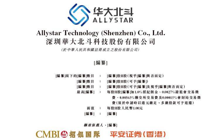 | 编纂 项下的 编纂 数目 | " | [编纂]股H股(視乎[编纂]奥否而定) | | --- | --- | --- | | [编纂]數目 | " | [编纂]股H股(可于 编纂]) | | [编纂 数目 | " | [编纂]股H股(可于编纂]及祝平 编纂 奥否而定) | | 故尚编纂 | " | 每股H股[编纂]加1.0%經紀佣金、0.0027%證監會交易禮 | | | | 費、0.00565%聯交所交易費及0.00015% 會財局交易檔 | | | | 費(須於申請時以港元繳足,多繳股款可予退還) | | 血值 | : | 每股H股人民幣1.00元 | | 【编纂 : | | 【消毒】 | 2025年12月19日,来自广东深圳龙岗区的 深圳华大北斗科技股份有限公司Allystar Technology (Shenzhen) Co., Ltd. (简称"华大北斗")在港 交所递交招股书,拟在香港主板挂牌上市。这是继其于2025年6月12日递表失效后的再一次申请。 华大北斗招股书链接: 主要业务 华大北斗,作为中国知名的空间定位服务提供商,提供支持北斗及全球主 要GNSS系统的导航定位芯片和模块,同时提供 ...