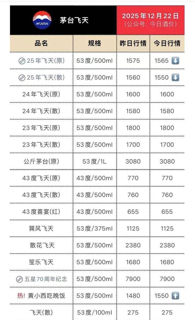 而素有"浓香之王"和次高端标杆之称的五粮液,今年的表现同样难言乐观。 "禁酒令"背景下的2025年,白酒行业步入极寒周期,高端白酒的金融属性与社交价值双双被削弱。如何稳住基本盘、重塑高 端价值成为首要课题。大象财富系列报道《白酒·破局》今日推出第一期《高端之困:茅台批价失守,五粮液艰难"渡劫"》。 "液体黄金"失守,经销商陷入进退两难 作为行业价格的天花板,飞天茅台批价的波动是市场信心的晴雨表。 然而,自今年5月禁酒令之后,这一"液体黄金"批价跌得可谓迅猛。6月跌破2000元大关,10月失守1700元防线,11月击穿 1600元,12月中旬触及1499元指导价后有所回升、随后再次回调。截至发稿当日(12月22日),散装飞天茅台较前一日下降10 元,价格为1550元/瓶。 | 茅台飞天 | | | | 2025年12月22日 | | --- | --- | --- | --- | --- | | MOUTAL | | | | (公众号:今日酒价) | | 品名 | | 规格 | 昨日行情 | 今日行情 | | 225年飞天(原) | | 53度/500ml | 1575 | 1565 | | 225年飞天(散) ...