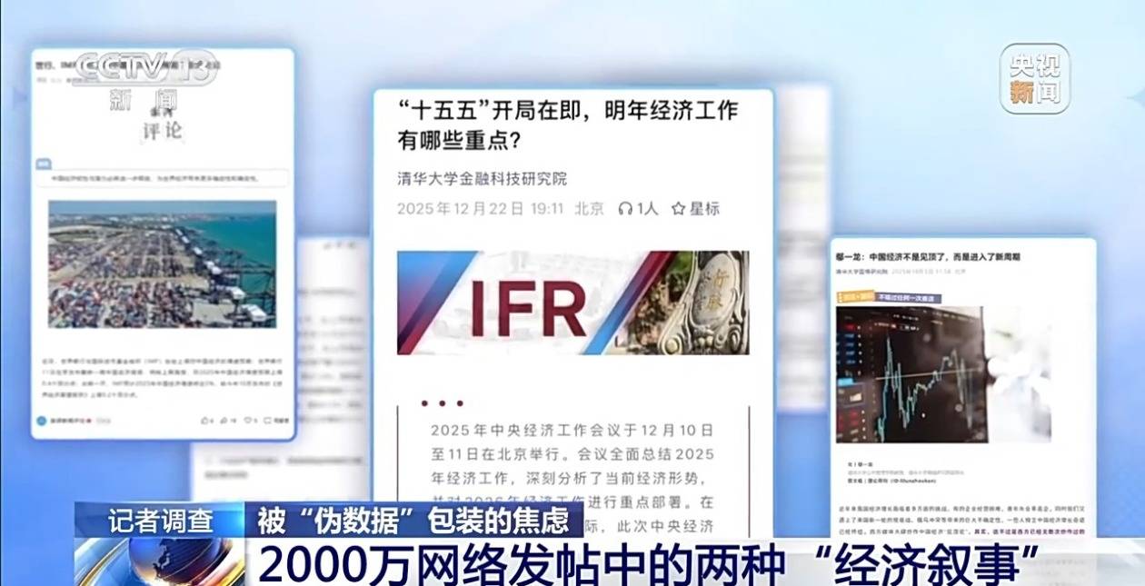 经过去重和分类,一个月内,全网与经济有关的原创文章和视频内容超过2000万条。其中"经济+市场""经济+数据"这两类关键词组合,声量最大、占比最 高,同时,"明年""普通人""政策"等词也是讨论的焦点。 把这2000多万条样本按情绪倾向划分,可以发现:同样讨论经济话题,网络表达明显呈现不同走向。 年终将近,权威经济数据尚未全部发布,但网络上的所谓"经济解读"已提前升温。网络信息监测平台显示,近30天围绕"中国经济""经济形势"的内容显著增 加。这些内容长什么样?来看记者调查。 关于"经济形势"的话题在网上到底有多大"声量"?记者启用网络信息监测系统,把时间窗口锁定在最近30天,设定"中国、经济、发展、数据"等几个核心 词,对全网公开内容做了一次抓取。 进一步拆解后,记者又在这些内容中看到截然不同的叙事风格: 第一种是相对理性的信息表达。这类内容的特点是以事实为主,以观点为辅,它们的标题通常中性,内容里会引用官方统计,发布时间也大多与官方数据的 发布节奏一致。 另一种则明显偏向情绪化的观点表达。它们的标题更像情绪口号,先把危机感摆在读者面前。内容结构上,这类帖子往往用"财富大收割"等强烈表述营造紧 张氛围。 同 ...