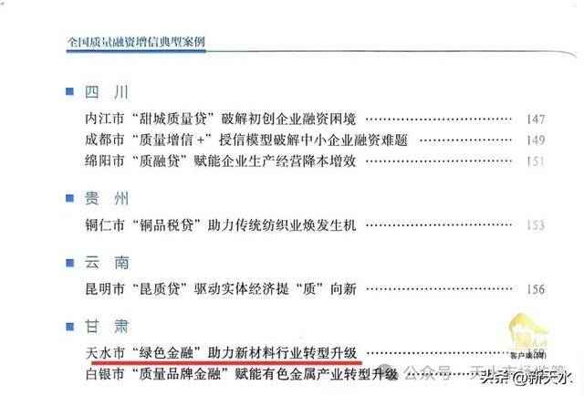 本报讯(天水融媒记者 张文都)近日,国家市场监督管理总局发布全国质量融资增信典型案例名单, 天水市推荐的《天水市"绿色金融"助力新材料行业转型升级》案例成功入选。这一成果不仅彰显了兰州 银行天水分行在落实质量融资增信工作中的务实举措,更标志着天水市在推动质量要素与金融资源深度 融合、服务实体经济高质量发展上迈出坚实步伐。 今年以来,天水市市场监管局联合人行天水分行等部门及金融机构,积极探索构建"合作银行+优质企 业+精准授信"联动模式。针对缺乏传统抵押物但质量优势突出的企业,引导合作银行依据企业质量信 用状况,提供低门槛、低成本信贷支持,为企业开辟融资新路径。截至目前,兰州银行天水分行等12家 金融机构已为30家质量效益型企业办理融资增信业务,累计融资近16亿元,增信额度达12亿元,有效激 发市场主体提质增效、创新发展的内生动力。 此次入选的典型案例中,甘肃华建新材料股份有限公司曾面临现金流短缺制约运营、缺乏长期资本支撑 绿色转型升级的双重困境。兰州银行天水分行立足企业质量信用基础,创新融资服务模式,设计出与可 持续发展绩效指标动态挂钩的贷款方案,通过价格调节机制精准匹配企业需求。该笔1000万元贷款在不 到 ...