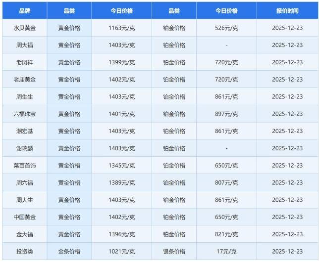 2025 年 12 月的贵金属市场,彻底被 "暴涨" 点燃。12 月 24 日,现货黄金盘中冲上 4511.93 美元 / 盎司,首次突破 4500 美元关口,年内累计涨幅超 1880 美 元,涨幅近 70%;白银也不甘示弱,现货白银触及 71.87 美元 / 盎司历史新高,年内涨幅更是逼近 140%。 国内市场同样沸腾,周大福、老凤祥等品牌足金饰品价集体突破 1400 元 / 克,12 月 24 日周生生足金饰品价再涨 8 元至 1411 元 / 克;就连更贴近原料价的 金条,银行售价也超 1020 元 / 克,水贝黄金原料价达 1163 元 / 克。有人晒出 "年初 20 克金条,如今账面多赚 1 万" 的收益,也有人纠结 "现在买会不会接 盘",黄金到底还能不能入手?看完这几点再做决定。 | 品牌 | 智能 | 今日份提 | 品类 | 今日份格 | 报价时间 | | --- | --- | --- | --- | --- | --- | | 水贝黄金 | 黄金价格 | 1163元/克 | 铝金价格 | 526元/克 | 2025-12-23 | | 周大福 | 育金价格 | 1403元/克 | 铝金价格 ...