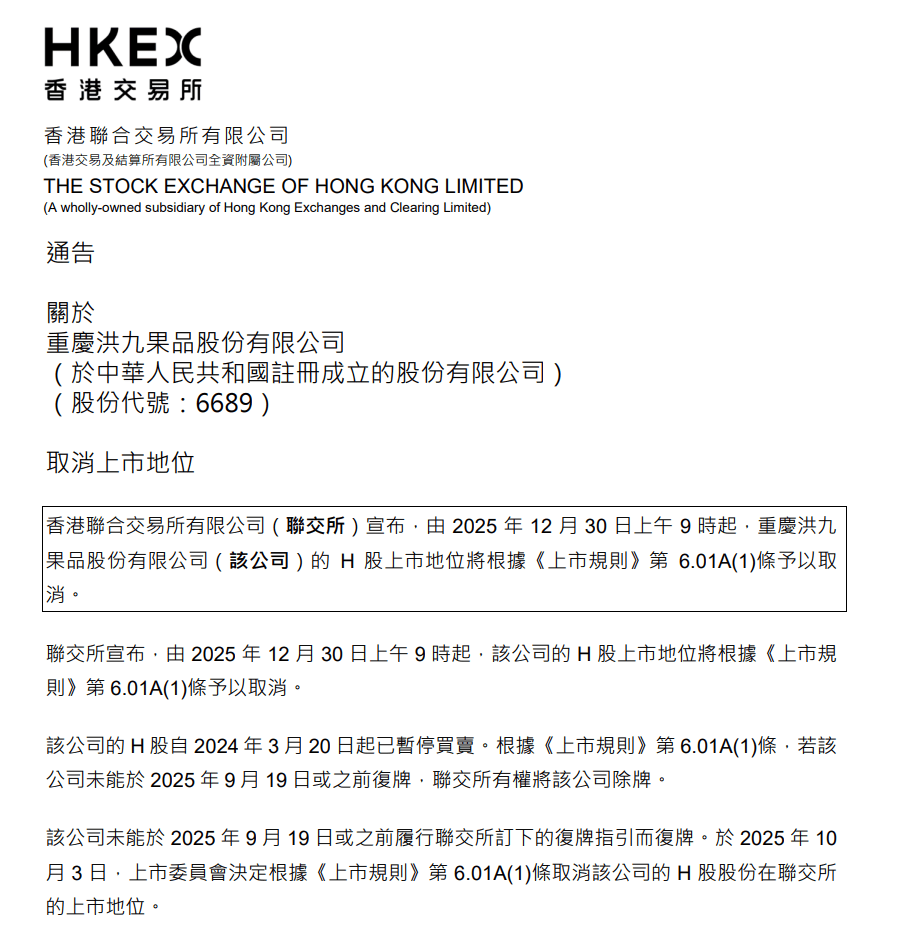 因无法按时披露财报,停牌超过一年半的"水果第一股"洪九果品迎来退市终局。 香港联交所:将取消洪九果品的H股上市地位 香港联合交易所发布公告,宣布自12月30日上午9时起,取消洪九果品的H股上市地位。 公开资料显示,洪九果品成立于2002年,是一家专注于高端进口水果和高品质国产水果全产业链运营的多品牌鲜果集团。公司通过"端 到端"数字化供应链,将鲜果产品从全球各地果园直接送达全国水果零售终端。公司自成立以来备受资本青睐。据洪九果品招股书,公 司IPO前完成了多轮融资,投资方不乏天壹资本、CMC资本、顺丰控股、招商资本、北大荒等知名机构。 2022年9月5日,洪九果品登陆港交所,成为首家以水果为主业的在港上市企业,被市场冠以"水果第一股"称号。彼时,公司发行价为 40港元/股,募资约4.97亿港元,总市值一度达到约600亿港元。2022年财报显示,公司营收达150.81亿元,同比增长46.7%;净利润 14.52亿元,同比激增近4倍。 董事长邓洪九等多名高管,此前被抓 上市不到两年,洪九果品于2024年3月因无法按时披露财报而停牌。彼时,审计机构毕马威会计师事务所关注到,截至2023年末,集团 预付款余额约44. ...